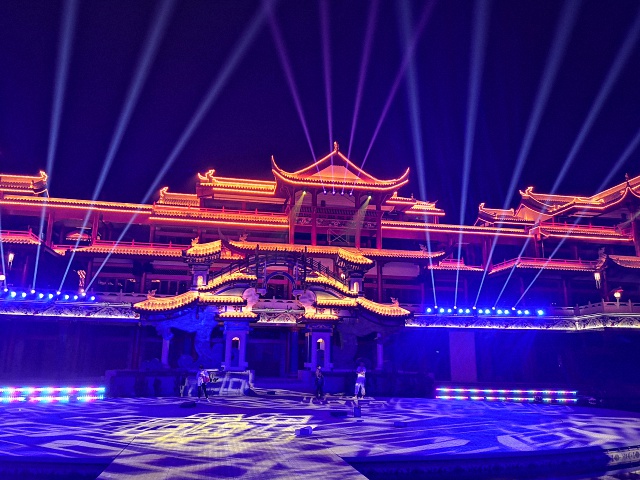 鹰皇科技为眉山市金府穿越城创新旅游文化商业项目——穿越主题的商业水街水舞台打造的绚丽灯光效果