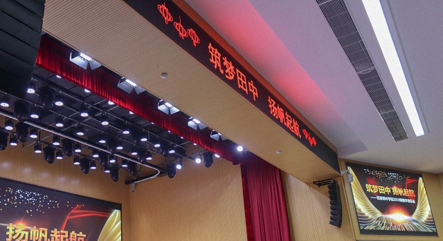 田家炳中学多功能音乐厅主要用于学校文艺表演、歌唱比赛等活动使用,日常也兼用于会议、报告使用。音乐厅配置了三块高清LED显示屏,除了舞台上方用作主显示用的屏幕外,在舞台口两侧上方也安装了LED侧屏用作同步显示画面或实况转播用途,舞台口上方设有一块全彩LED会标屏用于显示活动或会议名称使用。音乐厅音响系统采用了吊挂式线性阵列音箱作为全场主扩声系统,舞台上方配置有4台流动返听音箱。舞台灯光系统则有我司倾力量身打造。