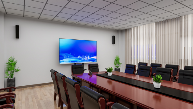 会议扩声系统:会议室前方两侧壁挂2只全频音柱音箱,声场可均匀覆盖整个会议室。会议音柱具备宽频响、高清晰度人声还原能力。