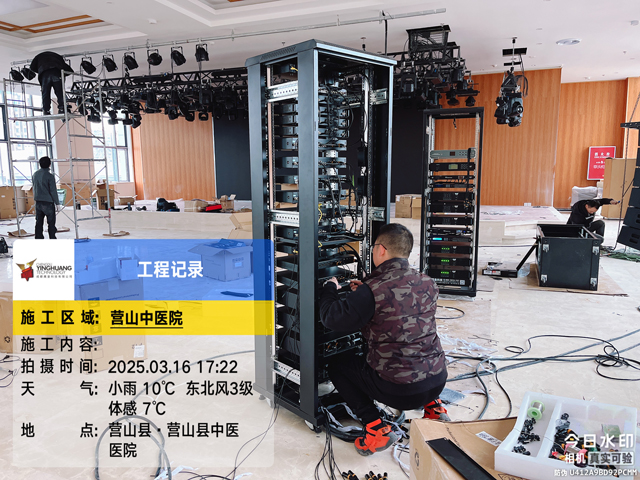 近日,营山中医院多功能厅灯光、音响、LED显示屏建设项目现场传来捷报:经过鹰皇科技工程团队多日争分夺秒的作业,厅内核心设备——LED显示大屏、舞台灯光系统及多功能厅扩声线阵列音箱及环绕补声音箱已全部完成设备安装,准备进入最终调试倒计时阶段。这一重要节点的顺利达成,标志着营山中医院多功能厅距离全面投入使用又迈出了坚实的一步。
